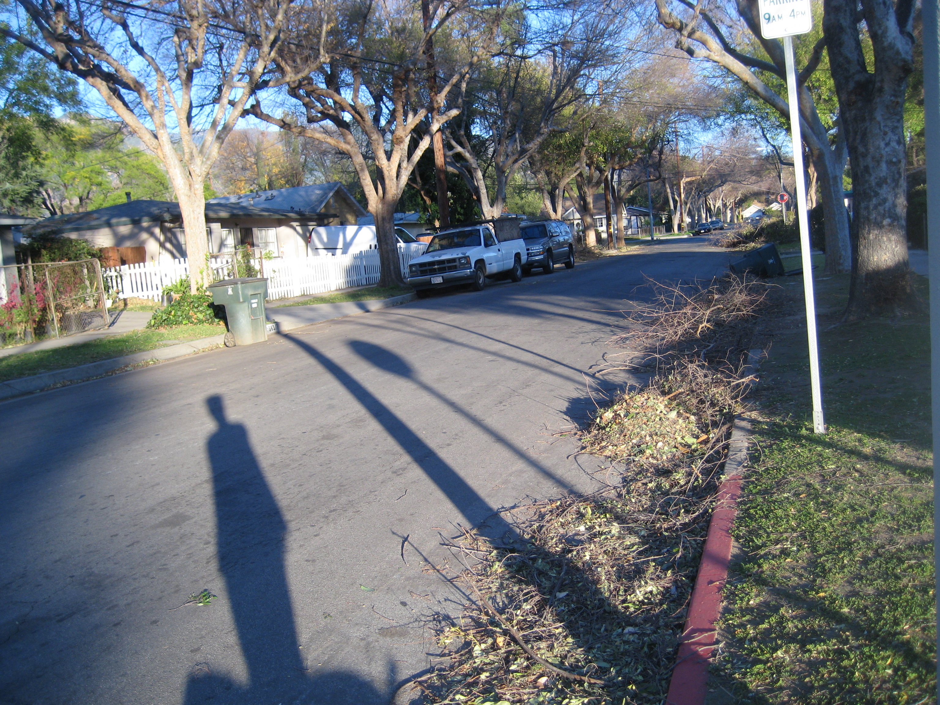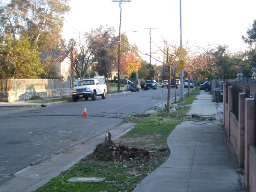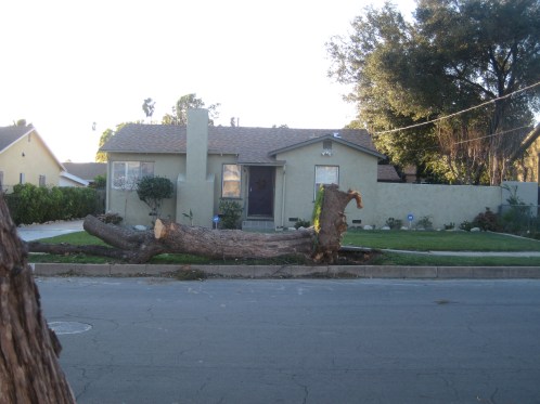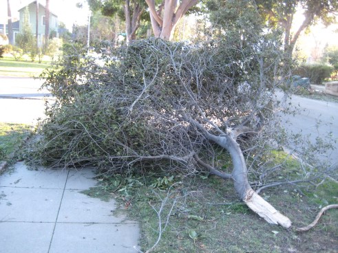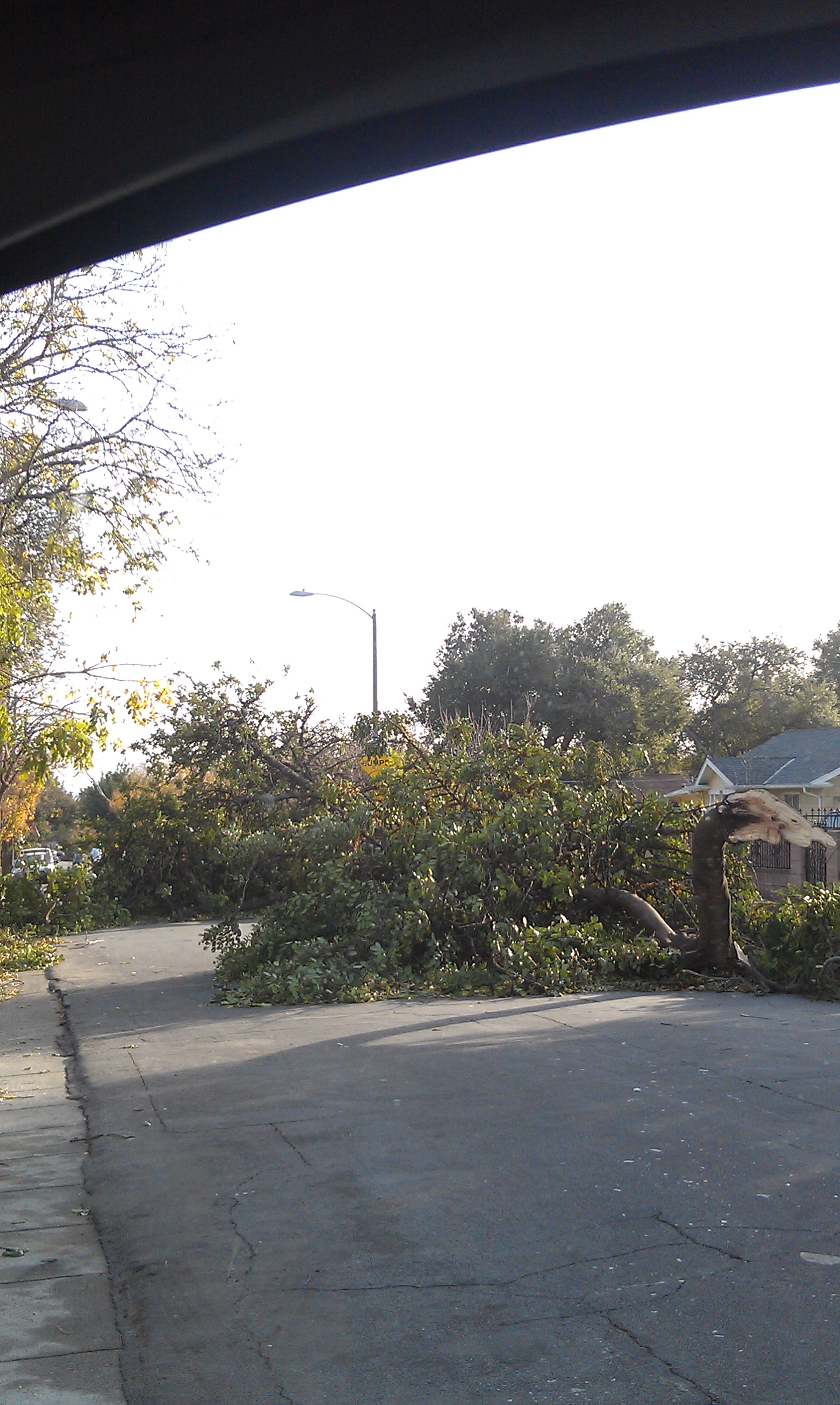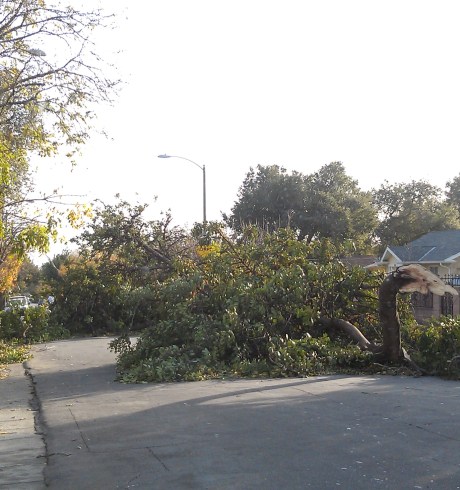 A few days ago, my city was visited by the winds of ridiculous. Everyone at some point had lost power (some are still without it), and trees, yards and fences were not left where we remembered them. Today I went for a walk with Flix and caught some photos of the neighborhood post the mini tornado. There were mostly piles of leaves and branches swept up against the curb, but we also found fallen power lines, collapsed fences and entire trees fallen into the street! Yikes!