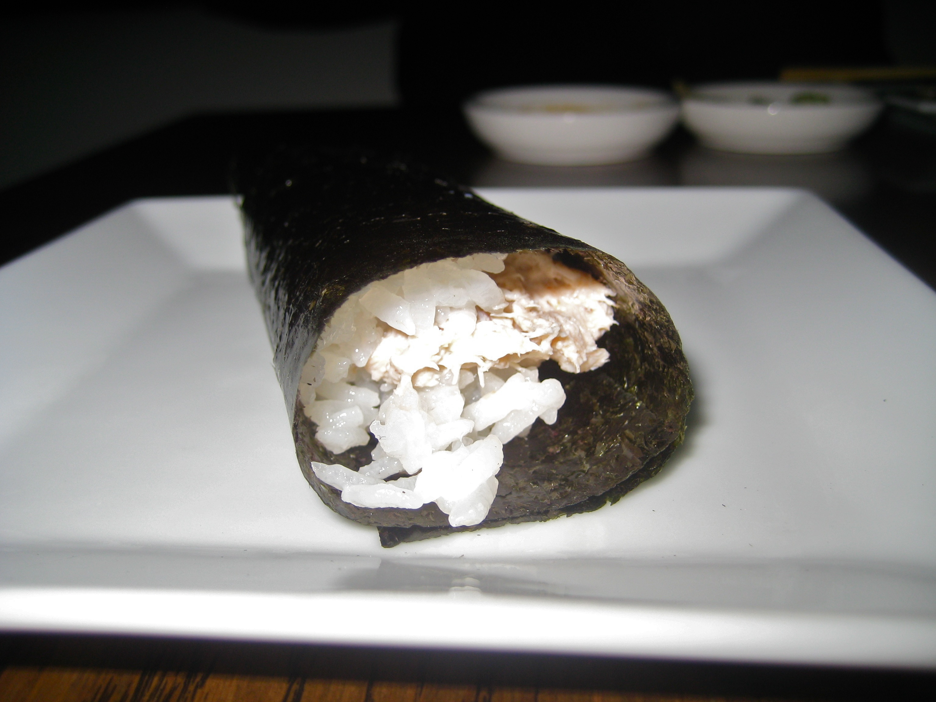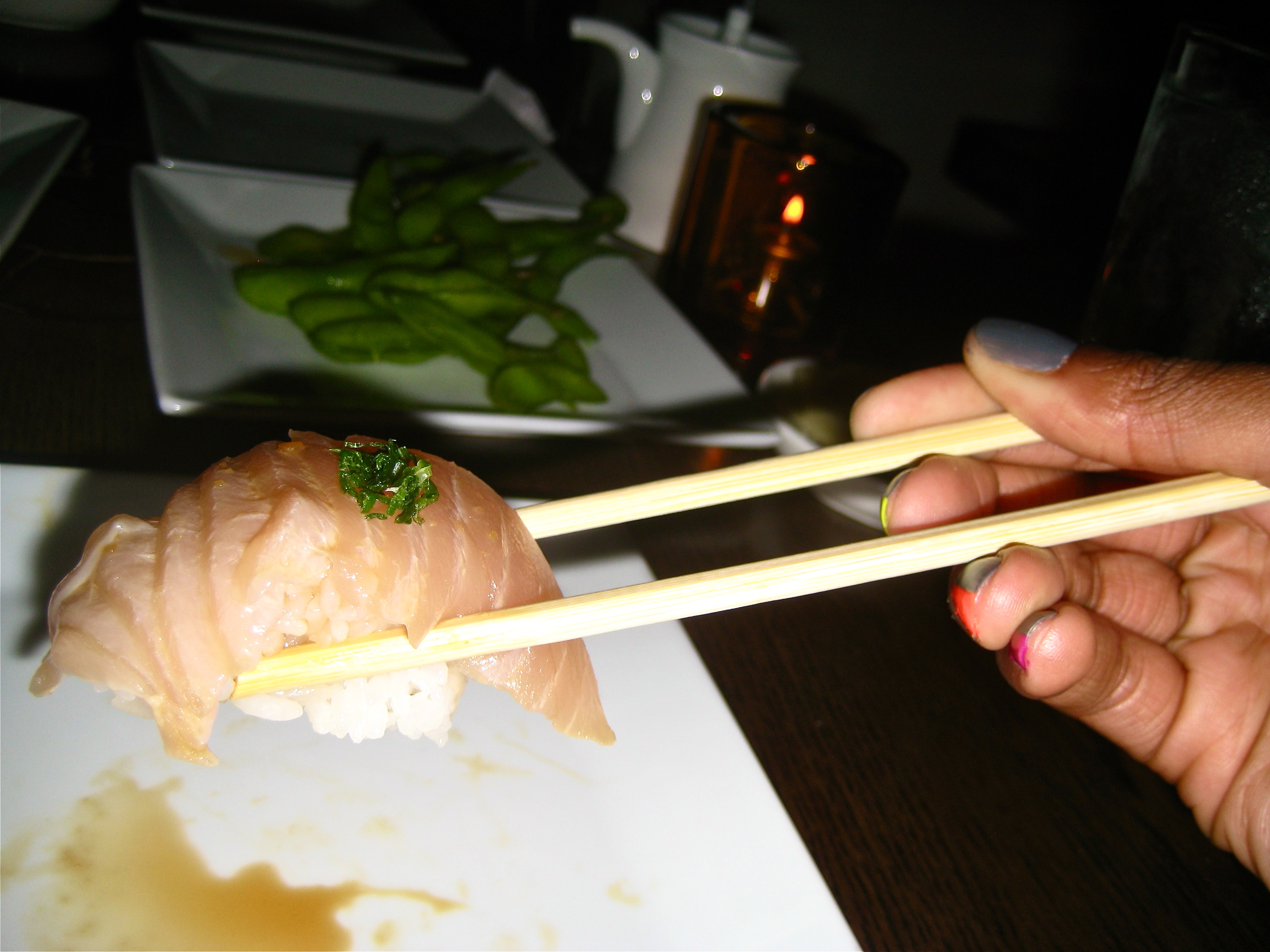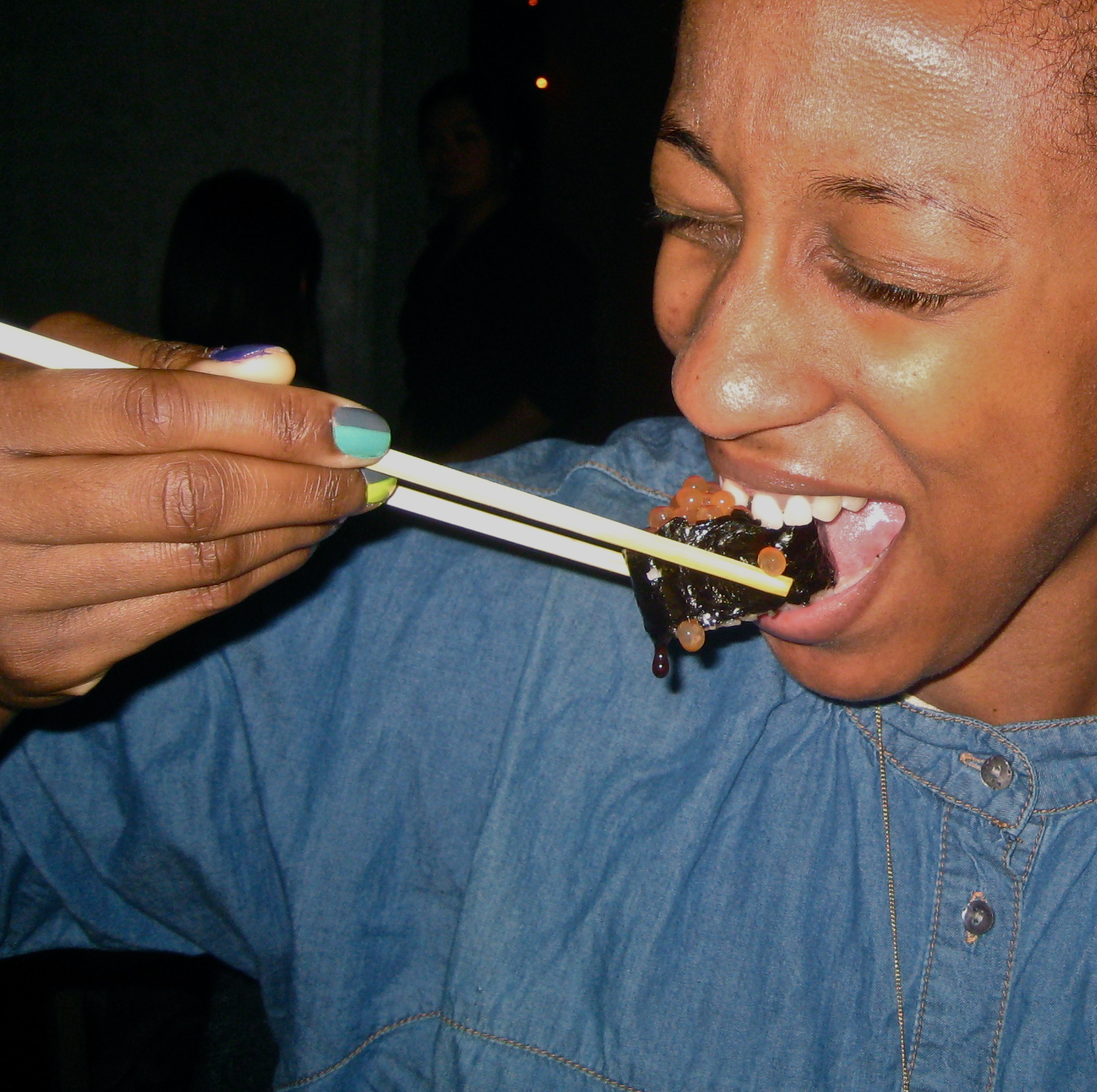 Then I start to think about how much of a foodie punk I would be not to eat it. It was kind of like my very own food challenge: “Shelya vs. Salmon Eggs”. I think a little more… “Well he did turn me on to anchovies. How much worse can this be?” So, being the somewhat adventurous foodie that I am, I grab a roll with my chopsticks, demand he takes a photo (I couldn’t promise this would happen again), and then… CHOMP!