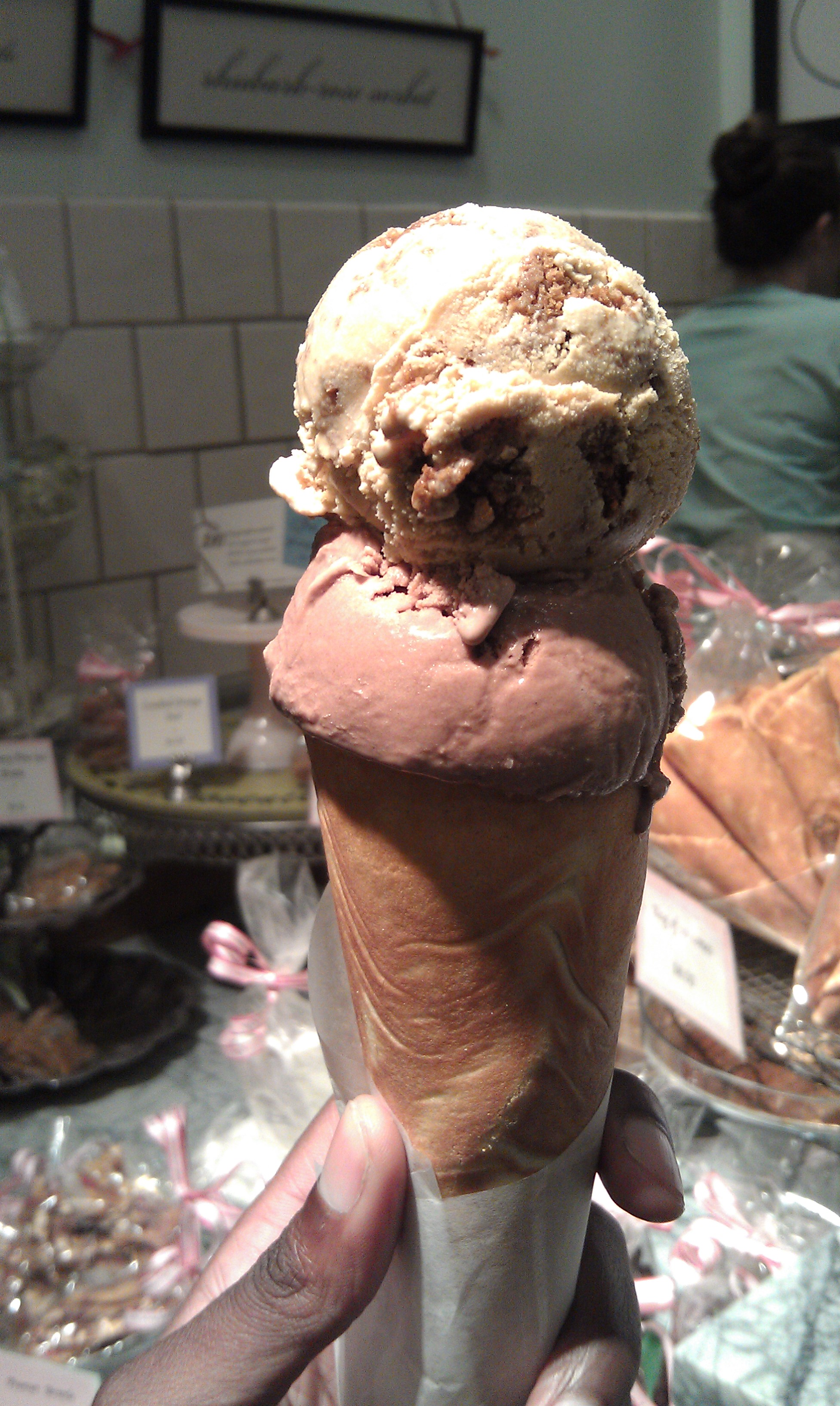 They allow you only three tastings before you pick which flavors you want. I chose to try the chocolate-covered pink peppercorn, chocolate mint and toffee, and brown sugar graham cracker. Finally went with the last two on my cone.