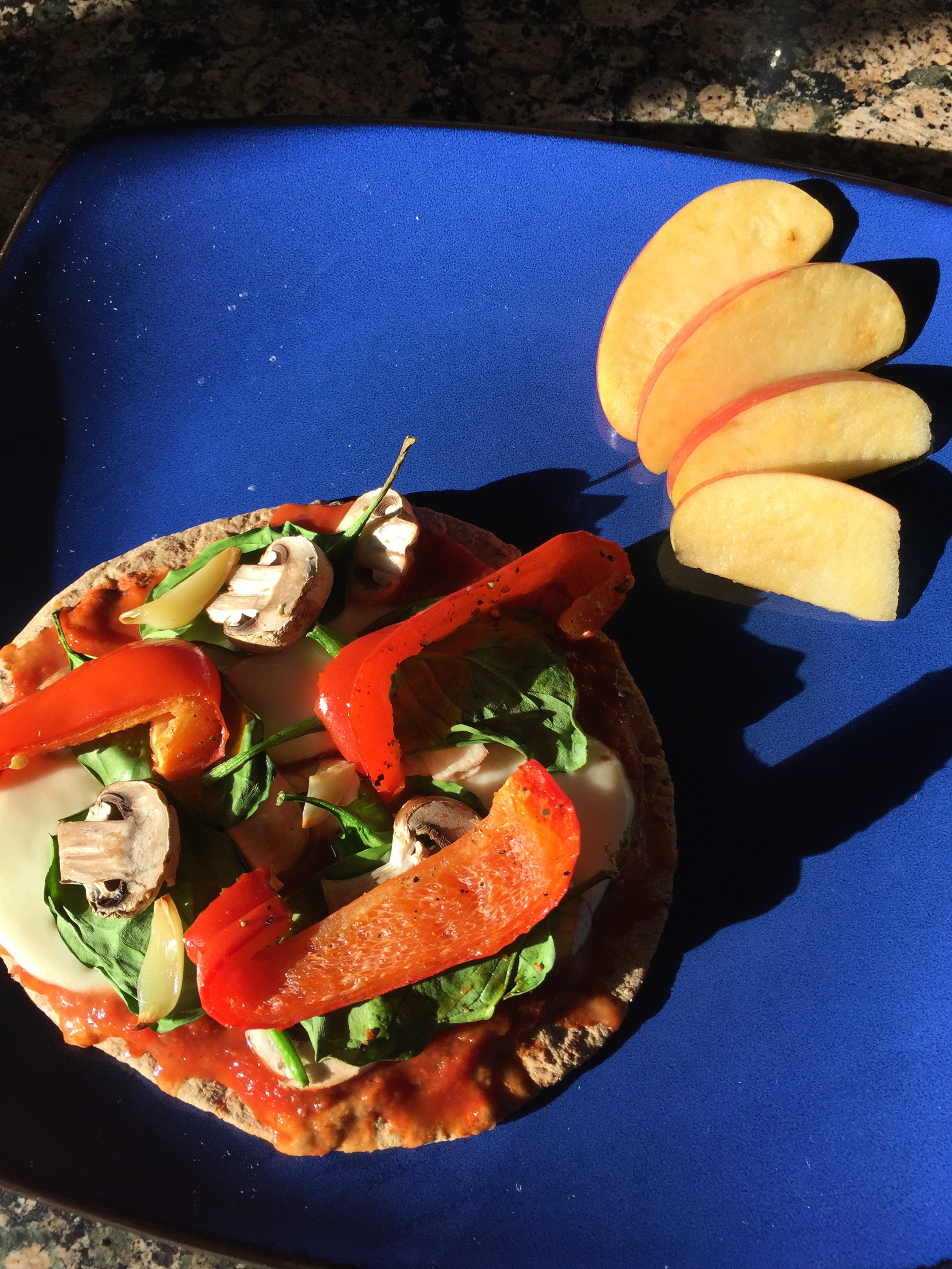 My dinner is a whole wheat pita pizza topped with spinach, mushrooms, roasted red bell pepper, and roasted garlic (the last two were extra veggies I had from the power bowl).